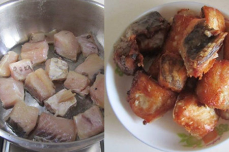 锅烧热之后,将腌入味的鱼块铺在锅底,并将香料挑出来,小火慢煎至双面金黄后盛出锅待用。