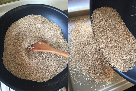 准备白芝麻,将锅烧热,里面什么也不放,然后把芝麻全部倒进去烘焙,开中小火,期间用铲子不断搅拌,目的是为了让芝麻炒得均匀,炒到芝麻散发出浓浓的香味,倒进一个平整的盘子中。