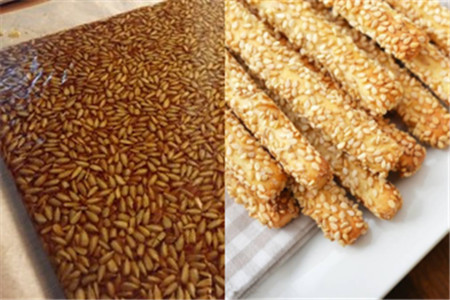 压平后揭开油纸,用刀切成长条,然后揉成圆棍状,当然也可以直接切成方块长条吃,按自己喜好切就行,好吃的芝麻棍就做好了。