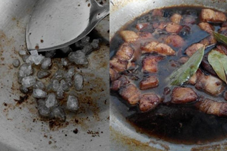 炒锅烧热,将猪肉块下锅爆炒,炒至表面微焦出油,即可盛出待用。炒锅重新烧热,加少量的油,放入冰糖,小火慢炒。冰糖融化并且颜色变深时,将炒过的野猪肉回锅,翻炒,再烹入适量老抽、泡姜醋和黄酒,加入香叶、八角和桂皮,转为大火煮沸后,加盖,转为小火焖煮1个小时以上即可起锅装盘。