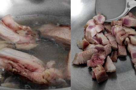 野猪肉清洗干净,切成条状,放入加了料酒的凉水中泡30分钟。锅中加适量清水和姜片,大火煮开,将泡好的野猪肉下沸水煮制。野猪肉煮变色后,捞出锅,用流水冲洗干净,切成小方块。