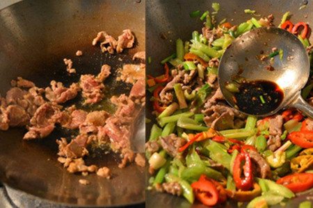 炒锅洗净上灶,放少许油烧热,将腌好的野猪肉锅,快速炒开。野猪肉炒变色后,将切好的芹菜段下火,翻炒。芹菜炒断生后,将红椒圈和青蒜段下锅,继续翻炒。所有食材都炒熟后,调入适量鸡精、生抽和盐即可起锅。