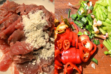 野猪肉清洗干净,切成小片,装入碗中,加入适量淀粉,用手将猪肉和淀粉抓匀,静置一边待用。芹菜和青蒜去根叶,切成小段。红辣椒洗净切成圈。