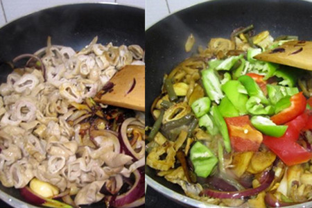 洋葱炒至变软后,将焯过水的肥肠下锅,再放入豆角酸,烹入适量生抽,炒匀。出锅前加入青红椒炒断生即可。