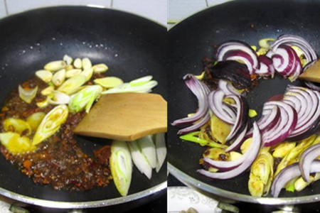 炒出香味后,将葱姜片和蒜瓣下锅,翻炒几下,再加入洋葱片,一起翻炒。