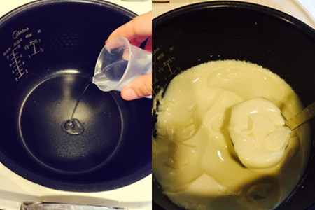 七、将内酯溶液倒入电饭锅中,将冷却一分钟的豆浆冲入,撇掉浮沫后选择保温键,保温二十分钟就完成凝固了。