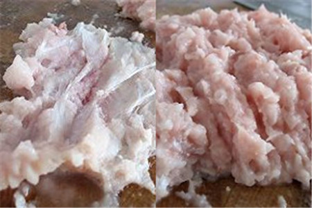 鱼肉准备好后就用刀背将之拍成肉末,如果喜欢有嚼劲的话,也可以把它切成碎丁,这样煮出来的鱼肉饺子在口中就会有颗粒感,更有嚼头,适合年轻人,如果是小孩或者老人,还是碎一点比较好。