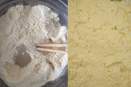 酵母粉用温水化开,然后倒进面粉里,搅拌均匀后揉成面团。放在温暖处发酵两个小时即可,打开的时候微微会有一点酸味。玉米面不经过发酵,直接做饼口感会非常硬,口感很差。