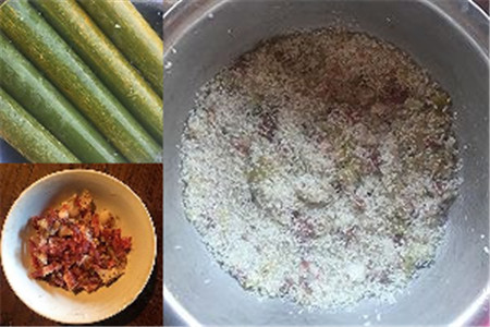 之后我们将腊肉切成丁状,将大米洗干净,然后我们将腊肉和大米放在一起,加入佐料调解味道,这一个步骤是非常的重要的,它决定了你的竹筒饭是否好吃,将调好的大米放入竹筒中。