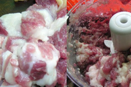 首先将买回来的猪肉切片。挑选猪肉的时候要选择半瘦半肥的,这样水饺的口感会更好哦。将切片好后的猪肉放进切肉机中,利用切肉机将肉绞碎。如果喜欢更好口感可以不使用切肉机,而是使用人手将肉切碎。