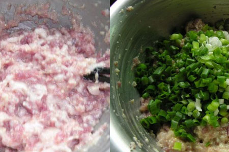 猪肉绞碎后放进碗中,然后顺时针将肉搅拌均匀,此时猪肉可以加入一些调味,例如小量的盐,如果口味清淡的此时可以不加调味。搅拌均匀后加入葱段。葱段越小越好,然后再与猪肉搅拌均匀。