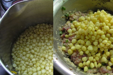 玉米粒加盐煮至八成熟,煮至全熟都可以,跟着捞起,再加入猪肉中。玉米的份量随自己的喜好,如果想肉味大一点的话玉米的份量相对少些,如果想玉米的味道大些就加多些玉米。