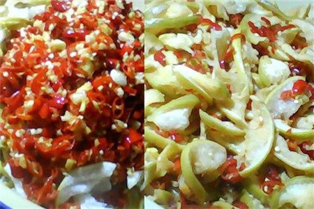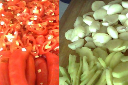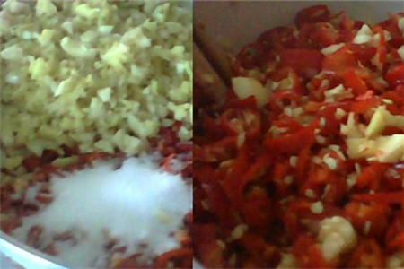 将切碎老姜、大蒜、辣椒混合,并加入盐和鸡精搅拌均匀,腌制3个小时后,将腌制出的多余水分倒掉。