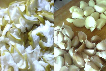 等到柚子皮泡了两天之后,将柚子皮捞出并挤干水分,放在沥水篮中备用,同时准备好大蒜、老姜、辣椒等材料,小编当时忘了拍辣椒的图片。