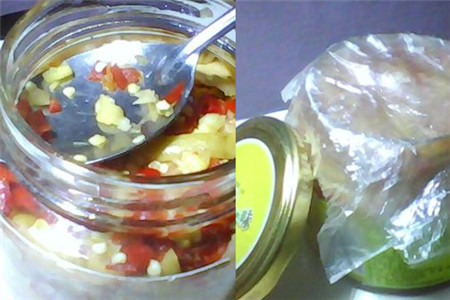 之后就可以准备装瓶了,找来密封的容器,用勺子将混合好的柚子皮装进容器中,小编找来的是玻璃瓶,装的时候尽量使劲往下压,这样可以挤出多余的空气,再用保鲜膜封好盖上盖子,放进冰箱。