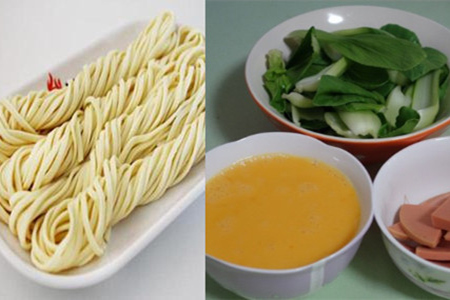那么煎蛋面是怎样制作的你们知道吗?现在我们来讲一讲。准备好面条,鸡蛋,青菜,火腿肠,当然还有一些基本的调味料。然后将鸡蛋调好,火腿肠切好,将青菜洗干净备用。