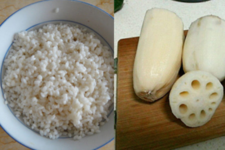 第一, 准备新鲜的莲藕,以及糯米、红糖、冰糖等材料。将莲藕洗净削皮,取一头,在接近头部的地方切开;糯米用清水事先浸泡。