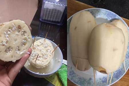 第二, 将泡好的糯米塞进莲藕的孔里,要塞满。以此类推,将每个莲藕都塞满,并用牙签固定好。
