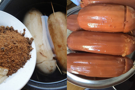 第三, 取一个汤锅,注入足量的清水,将莲藕放到锅里,并倒入红糖和冰糖,然后开大火烧开后转至小火,慢慢煲煮约40min。煲煮后的莲藕捞起放凉后切片后即可食用(不要切太薄)。