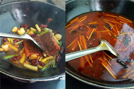 第二步:鱼用料酒泡了后洗干净放入少许的盐、淀粉搅拌均匀,这时候把锅拿出来预热,然后在里面倒入适量的菜籽油,油烧辣后把花椒、干辣椒、姜蒜放进去炒;油炒香后加入豆瓣酱继续炒,十秒后把鱼作料放进去炒散后倒入适量的开水。