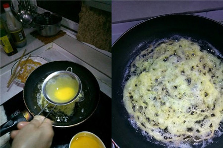 待到油锅里的油烧热后,筛子悬在油锅上方,把部分蛋液倒进筛子里,用手腕以打圈的方式转动筛子,漏完后继续往筛子里倒入蛋液重复以上步骤直到蛋液漏完,期间火不要开太大,否则会导致开始的蛋丝炸焦,用筷子轻轻拨动便于炸得均匀。