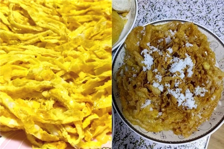 炸到两面金黄散发出香味就可以捞出来了,沥干油装进盘子中,根据个人口味在表面撒上一层白糖,好吃的油炸鸡蛋丝就做好了,香甜酥脆,满嘴留香,很适合聚会或者看电视的时候吃。