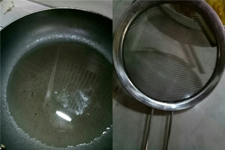 接下来把锅烧热倒入适量的食用油,还要准备一个洗干净的细网的筛子,这个筛子就是用来做鸡蛋丝的形状的。