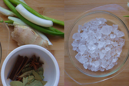 第二, 准备好大葱、生姜、香叶、八角、桂皮、冰糖等材料。