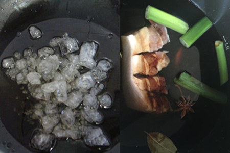 第三, 炒糖色:起热锅,倒入适量的油和冰糖,锅内的温度不断地升高使糖融化,并不断的用锅铲搅动,待到颜色变成深棕色即可盛起,浇在五花肉上。