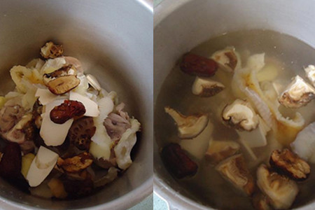 压力锅洗净上灶,将猪骨、鱼翅放入锅中,再把花菇、淮山、红枣和姜片放入锅中,然后兑入适量清水和料酒,加盖,开大火煮沸十分钟后转为小火。