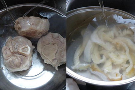 猪骨洗净斩成小块,用开水焯一下,再捞出用凉水冲洗一下。新鲜鱼翅洗净焯水,捞出用凉水冲凉。