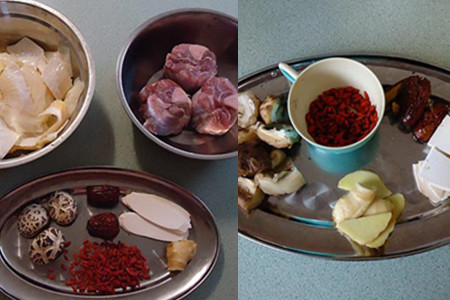 食材:新鲜鱼翅1000克、猪骨500克、干淮山、干花菇、枸杞、红枣、姜、料酒、盐。