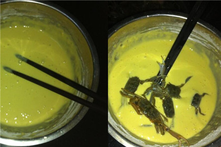 第二步,根据自己小螃蟹的数量在盆里面打几个鸡蛋,用筷子或者鸡蛋调散,跟自己的喜好放入盐等调味品。还可以放入一些淀粉,把鸡蛋羹调得粘稠一些。把清洗好的螃蟹放入鸡蛋羹里面,把每只螃蟹身上都沾满鸡蛋羹,把它们充分和均匀。