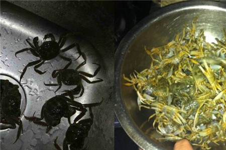 第一步,把在超市买来的活蹦乱跳的小螃蟹放在水槽里面,用小刷子把每一个小螃蟹的外壳和爪子挨个进行刷洗,一定要把它们身体每个角落的垃圾刷洗干净。清洗干净后放在漏水的盆子的里面,把水沥干净,放到一边备用。