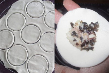 把和好的面团拿出放在平整的地方,取出擀面棒擀平后,用工具压出圆形的饺子皮,如果没有专业工具的话,用杯子也是可以的,剩余的边角料不要浪费,重新擀平继续制作饺子皮,饺子皮就基本做好了。在中间放入馅料包好。