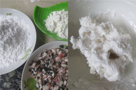 首先准备原材料,面粉100g,玉米淀粉30g,五花肉和黑木耳剁成末拌匀作馅料备用,馅料可根据自己的口味随意搭配。将面粉装进碗中,倒入少许开水烫熟拌匀。
