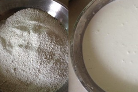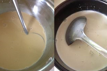 第三, 将搅拌好的马蹄粉浆分别兑入放凉的黄片糖水和椰奶浆中。