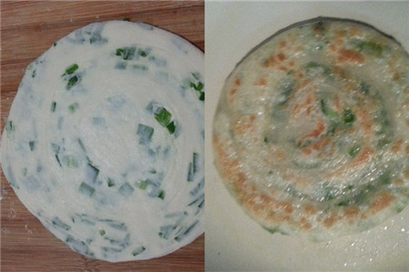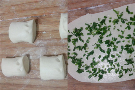 拿出面团,揉成几块大小均匀的小团,再用擀面棒将小面团擀成一层薄薄的面片,之后在面片上抹适量油和少许食盐,然后撒上一层切好的葱花。