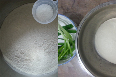 准备面粉,加入适量的食盐后倒入少许热水用筷子搅拌,再慢慢加入凉水,用手和成光滑的面团放一旁静置20分钟,如果觉得面团太稀沾手的话,可以抹上一点食用油,然后把葱洗干净备用。