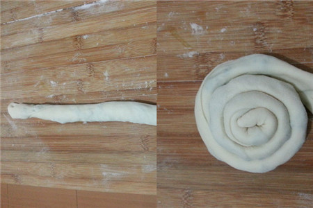 调料放完后,顺着面片横着的方向从上往下卷成长条状,接下来沿着一端继续一圈一圈地卷成圆,尾端按压一下即可。