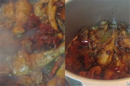鸡肉表皮呈金黄色后加少许豆瓣酱继续翻炒,直到把其中的水分和油分炒出来。炒到鸡块五六成熟后装进高压锅中,这时的鸡块已经完全上色了,只是还没有熟透,高压锅可以使之变得更加入味香软。