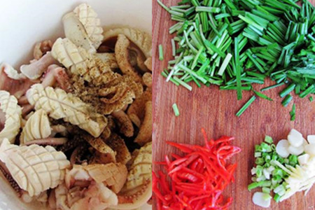 鲜鱿鱼2条、韭菜100克、红椒30克、葱、姜、蒜片、料酒、胡椒粉、白糖、生抽、香油、鸡精、盐、油。
