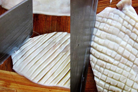 用刀在鱿鱼内面划上斜角花刀,再换一个角度划上十字花刀。