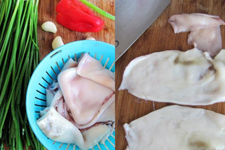 新鲜鱿撕掉黑膜,清洗干净,滤干水分待用。韭菜摘去黄叶,洗净滤干待用。鱿鱼身一切为二,去掉头部。