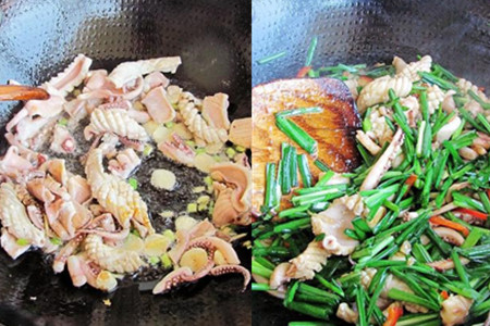 炒锅洗净上灶,倒入适量油烧热,将葱姜蒜末下锅爆香。爆香之后,将腌入味的鱿鱼卷下锅翻炒翻炒几下后,烹入适量盐、白糖和生抽,继续翻炒。接着将韭菜段下锅翻炒,再放入红椒丝,烹入适量香油和鸡精,炒匀即可熄火。