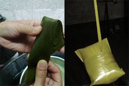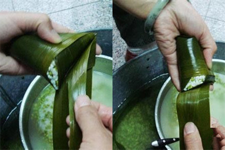 然后把留出的长的一端粽叶翻过去包住圆锥口,一直绕到尖角处,叶片一端紧贴着尖角绕到另一端,期间一定要手上使劲,让粽子包得紧紧的,否则就算包好了煮的时候也容易散开。