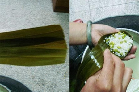 准备粽叶,洗干净后拿出一片,叶片大的一端在下面折成圆锥状,叶片小的一端留在外面,然后往圆锥里装入做好的馅料和糯米,手要握紧底部以免太松导致馅料漏出。