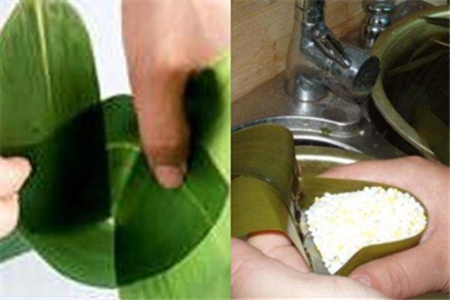 然后我们要先将树叶洗干净,将糯米淘好,这下才可以开始包粽子,先将叶子裹成一个圆锥形,要留一些树叶在上面,然后将糯米放适量的在叶子中,要确保放入的糯米能够全部被包进去。