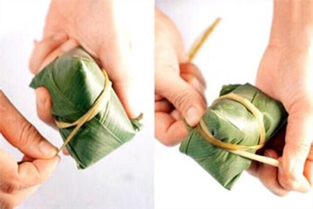 然后捏住叶子的两端,将两端捏进糯米中,按照粽子的形状,将叶子顺着粽子包过去,然后捏紧之后用绳子捆住粽子的每一个角,这样粽子便算是完成了,是不是很简单呢?