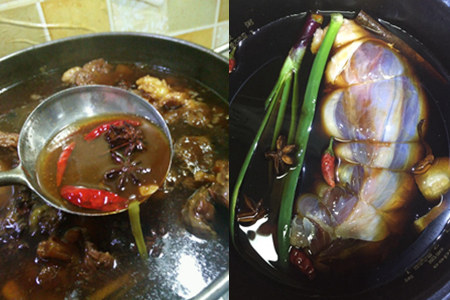 第二, 牛腱肉洗净后切大块,下到热水锅中,待水烧开之时滤去浮沫。随后将以上香料统统入到锅中。